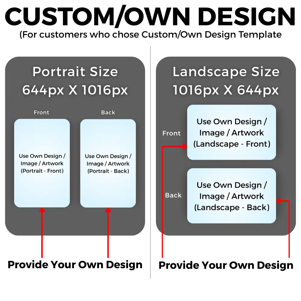 Custom Template / Own Design (A) NFC + OWN Bio Link Please provide all the necessary information as below for us to process your NFC Digital Business Card promptly. Thank you. Form (Own Design/Custom Template + Existing Bio Link) - BIEmail AccountUsernameOrder IDPlease provide us with you website address / online bio URL link (example Linktree, LinkedIn, HiHello, etc) you wish to encode into the NFC card.For customers who chose the CUSTOM/OWN DESIGN Template Image size: 644px X 1016px (Portrait) or 1016px X 644px (Landscape) Acceptable image file format: PNG, JPEG, JPG. Please refer to the example of image as below: Optional: If you need help with Template image dimensions or design, you can use the following tools to create the image file you want. Create your desired Portrait vCard Template Image File via the button link below: Create Portrait Image File Create your desired Landscape vCard Template Image File via the button link below: Create Landscape Image File After creating your desired image file, you can download the file via the Canva web/app and then upload them here. Note: The above Canva link is a shared link. Kindly do not store your completed designs here after downloading them. Please do not disturb, delete, or modify other people’s designs, if any are present. Upload Custom/Own Template Design Image File (Front) - *Format file: PNG, JPEG, JPG.Upload (Front) Upload Custom/Own Template Design Image File (Back) - *Format file: PNG, JPEG, JPG.Upload (Back) Submit Form