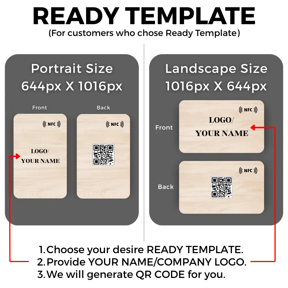 Ready Template (B) NFC + NEW Bio Link Please provide all the necessary information as below for us to process your NFC Digital Business Card promptly. Thank you. Form (Use Ready Template + New Bio Link) - BIUsernameOrder IDFor customers who choose READY TEMPLATE design Please refer to the example picture below: Your Name/Company Name (to be printed on your NFC Digital Business Card)Upload Company Logo Image File (Optional) You can skip this part if you do not want to put company logo on yr NFC card. Acceptable image file format: PNG. Upload Company Logo Image File (Optional) - *Format file: PNG.Upload VCARD INFO SECTION Please upload the required image file(s) based on the format and size accordingly.Example of Blinq vCard LayoutEMAIL ADDRESS FOR CREATING VCARD ADMIN PANEL Please provide an Email address so we can create a vCard Admin Panel account for your NFC card. We will use this email address to create a vCard admin panel account for you. You can access & edit your profile data anytime via this admin panel if needed. Please Take Note: Guidelines for providing us with the email address. One (1) email address is entitled to create one (1) vCard admin panel account only. If you have bought more than one (1) NFC card with us, please provide another email address for the second NFC card & so on (Please DO NOT provide the same or previous email address) Or if you already bought from us the NFC business card before, please do not use the same or previous email address that you gave us. Please DO NOT use or provide us with the general email address format, such as admin@xxx.com, contact@xxx.com, etc The email address provided MUST be more personalized, such as shamsul123@gmail.com, kenny569@xxx.com, etc. Email Address (For creating your vCard Admin Panel Account)Your Name (to be display on vCard)Job Title (Optional)Company Name (Optional)Accreditations (Optional)Handphone number (Optional)WhatsApp Number (Optional)Telegram (Optional)Office Tel Number (Optional)Business Email (Optional)Business/Office Address (Optional)Facebook/Meta link (Optional)Instagram (Optional)Official Website (Optional)YouTube (Optional)Others (Optional)VCARD THEME COLORPlease choose one vCard Theme colour only. Red Theme Orange Theme Yellow Theme Brown Theme Green Theme Cyan Theme Sky Blue Theme Blue Theme Purple Theme Pink Theme Black Theme Grey ThemeIMAGE LAYOUT SECTION Please upload the required image file(s) based on the format and size accordingly.Upload Profile Image File Image size: 500px X 500px Acceptable image file format: PNG, JPEG, JPG. Please refer to the example of image as below: Optional: If you need help with Profile Image dimensions or design, you can use the following tools to create the image file you want. Create your desired Profile Image File via the button link below: Create Image File After creating your desired image file, you can download the file via the Canva web/app and then upload them here. Note: The above Canva link is a shared link. Kindly do not store your completed designs here after downloading them. Please do not disturb, delete, or modify other people’s designs, if any are present. Upload Personal Photo/Logo Image File - *Format file: PNG, JPEG, JPG.Upload Upload Photo Cover Image File Image size: 1366px X 763px Acceptable image file format: PNG, JPEG, JPG. Please refer to the example of image as below: Optional: If you need help with Photo Cover Image dimensions or design, you can use the following tools to create the image file you want. You can create your desired Photo Cover Photo Image File via the button link below: Create Image File After creating your desired image file, you can download the file via the Canva web/app and then upload them here. Note: The above Canva link is a shared link. Kindly do not store your completed designs here after downloading them. Please do not disturb, delete, or modify other people’s designs, if any are present. Upload Photo Cover Template Image File - *Format file: PNG, JPEG, JPG.Upload Upload Company Logo Image File Image size: 640px X 357px Acceptable image file format: PNG, JPEG, JPG. Please refer to the example of image as below: Optional: If you need help with Company Logo Image dimensions or design, you can use the following tools to create the image file you want. You can create your desired Company Logo Image File via the button link below: Create Image File After creating your desired image file, you can download the file via the Canva web/app and then upload them here. Note: The above Canva link is a shared link. Kindly do not store your completed designs here after downloading them. Please do not disturb, delete, or modify other people’s designs, if any are present. Upload Company Logo Image File - *Format file: PNG, JPEG, JPG.Upload Submit Form